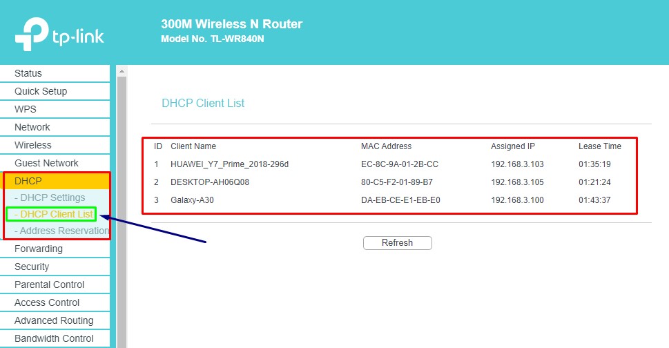 وبعد تسجيل الدخول بنجاح إلى لوحة تحكم الراوتر ستظهر لوحة التحكم وسننتقل مباشرة إلى الخيار DHCP Clint List الذي يقوم بعرض جميع الأجهزة المتصلة بالراوتر مع معلومات الهاتف الأندرويد او اسم جهاز الكمبيوتر و عنوان mac Address و ip كل جهاز معك في نفس الشبكة ، وبالتأكيد ستفيدك هذه القائمة في معرفة الأجهزة المتصلة وتحديد غير المرغوب منها أيضا وحظر سرقة النت.