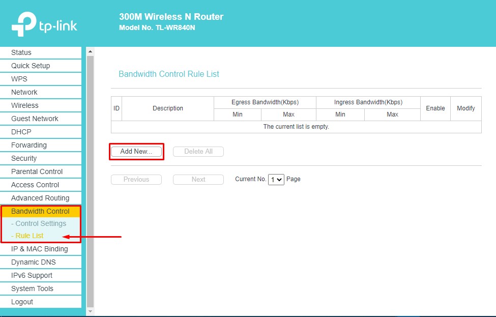 ثم ننتقل إلى المرحلة الثانية لتمكين تحديد سرعة الانترنت من خيار Bandwidth Control نختار Rule List ثم نضغط على زر Add New لإضافة تحكم جديد بجهاز على شبكة الروتر.