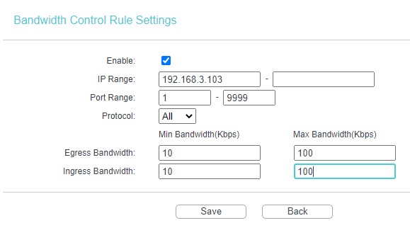 بعد الضغط على Add New ستظهر نافذة، من خلالها يقوم المستخدم بلصق عنوان ip الجهاز المستهدف في مربع IP Range، ومن ثم يختار نطاق المنافذ port Range الذي سيطبق عليه ضبط سرعة الانترنت ويفضل أن يتم اختيار من الرقم 1 إلى الرقم 9999 ليعمل الفلتر على جميع الاتصالات ، وفي المربعات الأخيرة min Bandwidth و max Bandwidth يفضل الاختيار للحد الأدنى والحد الأعلى للسرعة التي ترغب في وضعها لهذا الجهازللتحكم في سرعة الانترنت الخاصة بالراوتر من حيث زيادتها أو نقصانها وتقاس السرعة بوحدة الكيلو بايت في الثانية Kbps ، وأخيرا نضغط على زر save لحفظ جميع التعديلات.