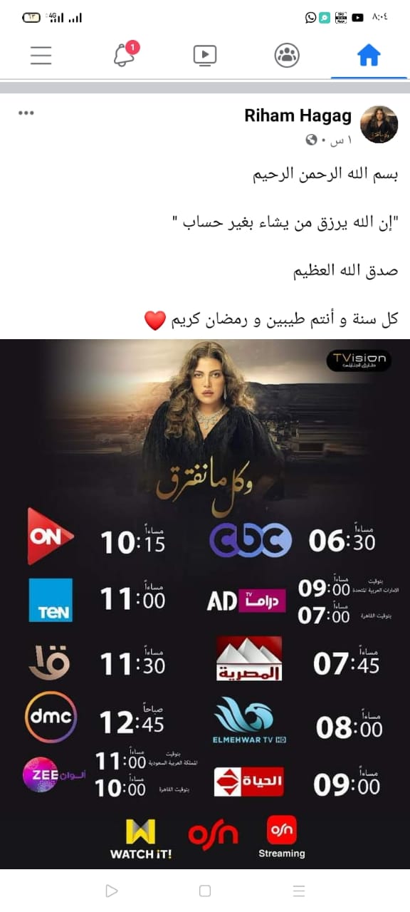 ونشرت ريهام حجاج مواعيد الخاصة لمسلسها، عبر حسابها الشخصي بموقع التواصل الاجتماعي “فيس بوك”، وعلقت قائلة: “بسم الله الرحمن الرحيم.. ”إن الله يرزق من يشاء بغير الحساب".. صدق الله العظيم.. كل سنة وأنتم طيبين ورمضان كريم".