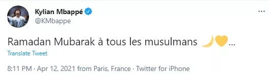 وكتب مبابي عبر صفحته الشخصية على موقع التواصل الاجتماعي تويتر: "رمضان مبارك لجميع المسلمين".