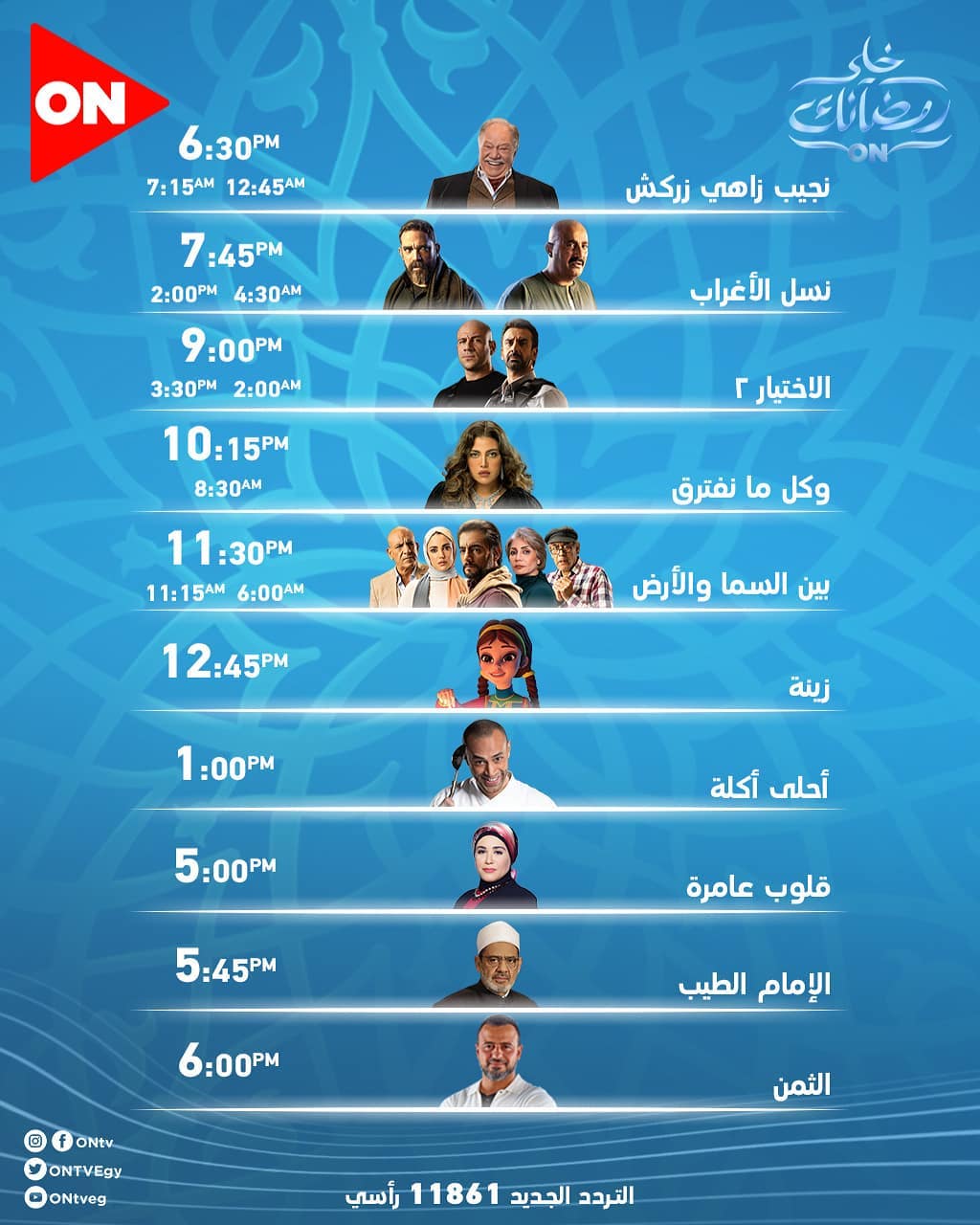 وتعرض قناة on في رمضان 2021 العديد من المسلسلات المتنوعة، وأعلنت القناة عن مواعيد عرض مسلسلات رمضان، وهي كالتالي: