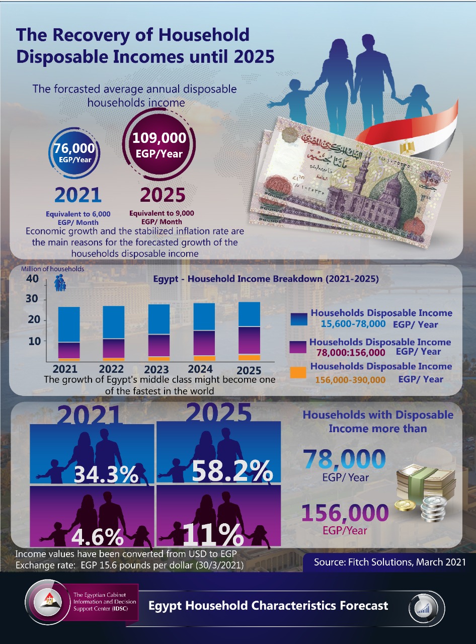 رصد مركز المعلومات ودعم اتخاذ القرار بمجلس الوزراء؛ تقريرًا من وكالة "فيتش سولوشنز" حول توقعات خصائص الأسرة المصرية حتى عام 2025، في صورة إنفوجرافيك تحت عنوان "انتعاش دخل الأسر بحلول عام 2025: فيتش تتوقع"؛ إذ توقعت نمو دخل الأسر المصرية مدفوعًا بالنمو الاقتصادي واستقرار معدل التضخم، وانخفاض معدل زيادة الأسر حتى عام 2025 عن السنوات السابقة، لتصبح 29 مليون أسرة في عام 2025، مقارنةً بنحو 27 مليون أسرة في عام 2021.
