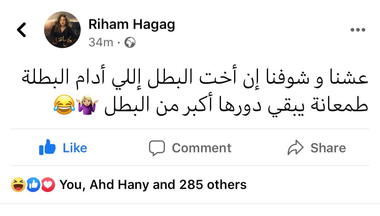 وكانت الفنانة ريهام حجاج كتبت بوست، عبر حسابها الرسمي بموقع "فيس بوك"، تلميحًا عن أيتن عامر قالت فيه: "عشنا وشوفنا أن أخت البطل اللي قدام البطلة طمعانة يبقى دورها أكبر من البطل".