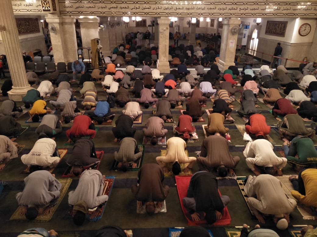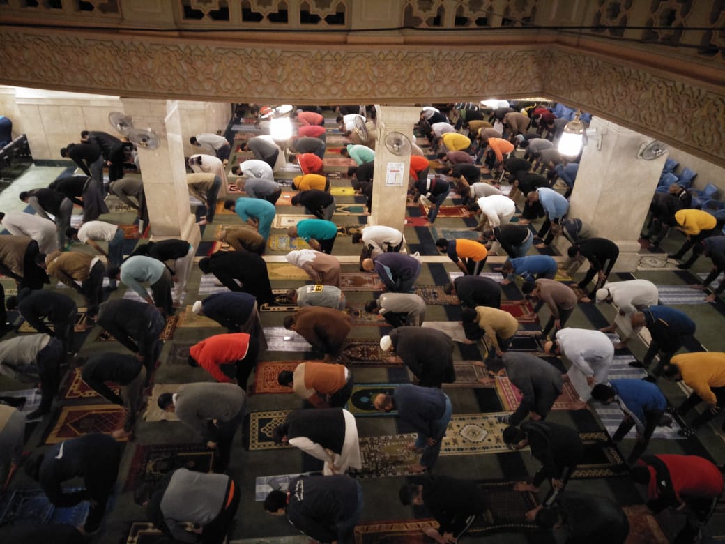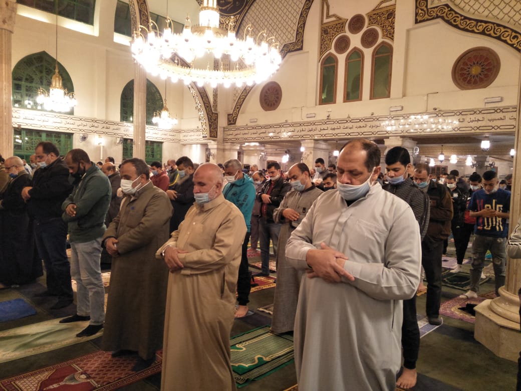 وتزين المسجد بالأنوار والزينة، بالتزامن مع صلاة التراويح الأولى منذ العام الماضي، وشهد المسجد توافد المئات من المصلين مع التشديد على اتخاذ الإجراءات الاحترازية بين المصلين؛ وتطبيق التباعد في المسافات وإرتداء الكمامات الواقية لعدم تفشي الوباء.