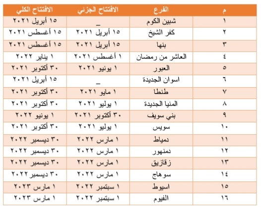 و جاءت مواعيد الافتتاحات للفروع فى المدن والمحافظات المختلفة، على النحو التالى:-