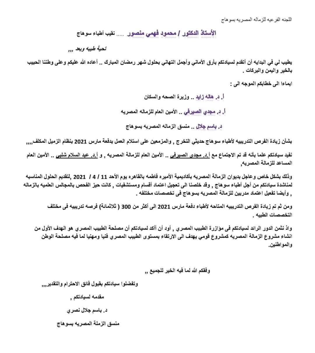 تقدمت النقابة العامة للأطباء بالشكر لكل من الدكتورة هالة زايد، وزيرة الصحة، والدكتور مجدي الصيرفي، الأمين العام للزمالة المصرية، والدكتور باسم جلال، منسق الزمالة المصرية بسوهاج، وذلك لسرعة الاستجابة لطلب أطباء سوهاج بشأن زيادة فرص التدريب الخاصة بالأطباء حديثي التخرج والمزمع استلامهم العمل بدفعة مارس 2021 بنظام الزميل المكلف، الذين سبق وتقدموا بمناشدة لتوفير أماكن ومدربين لتدريبهم فى مستشفيات المحافظة، بدلاً من استلامهم العمل فى محافظات أخرى وبالتالى حرمان محافظة سوهاج من أطباءها فى ظل احتياجها الشديد لهم.