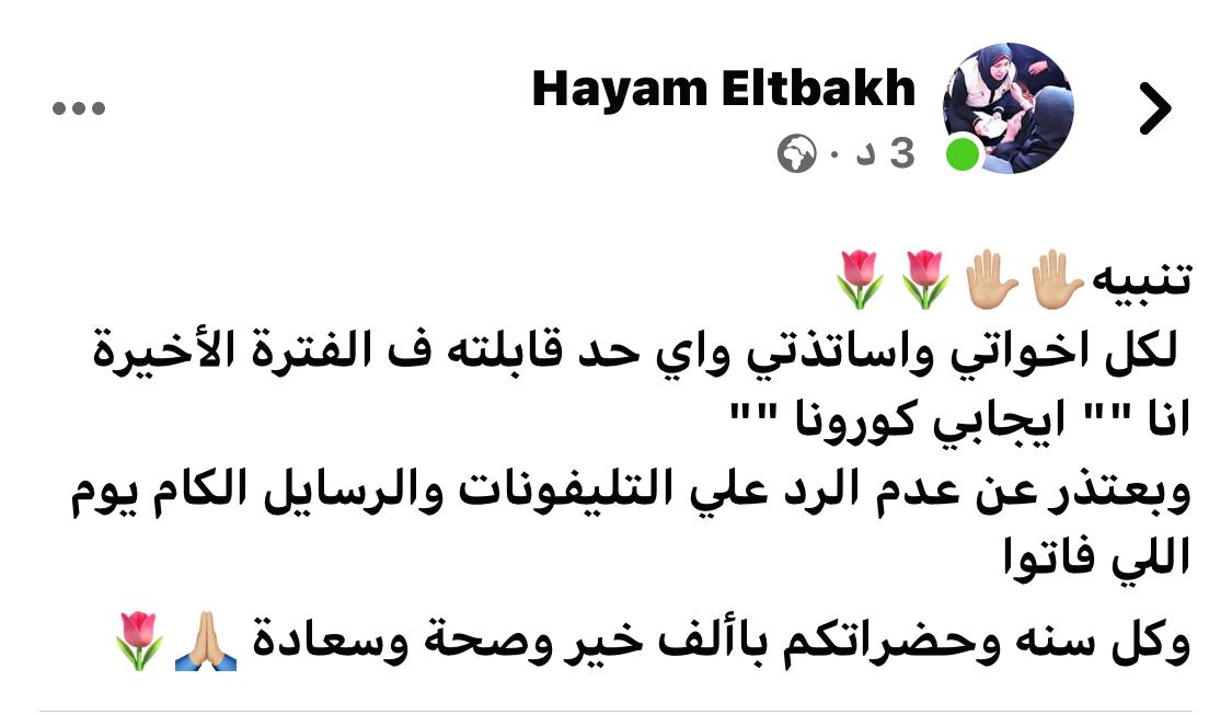 وأضافت الطباخ، عبر صفحتها على موقع التواصل الاجتماعي "فيس بوك"، أنها تنبه كل من تعامل معها خلال الفترة الأخيرة بسبب إصابتها بفيروس كورونا المستجد.