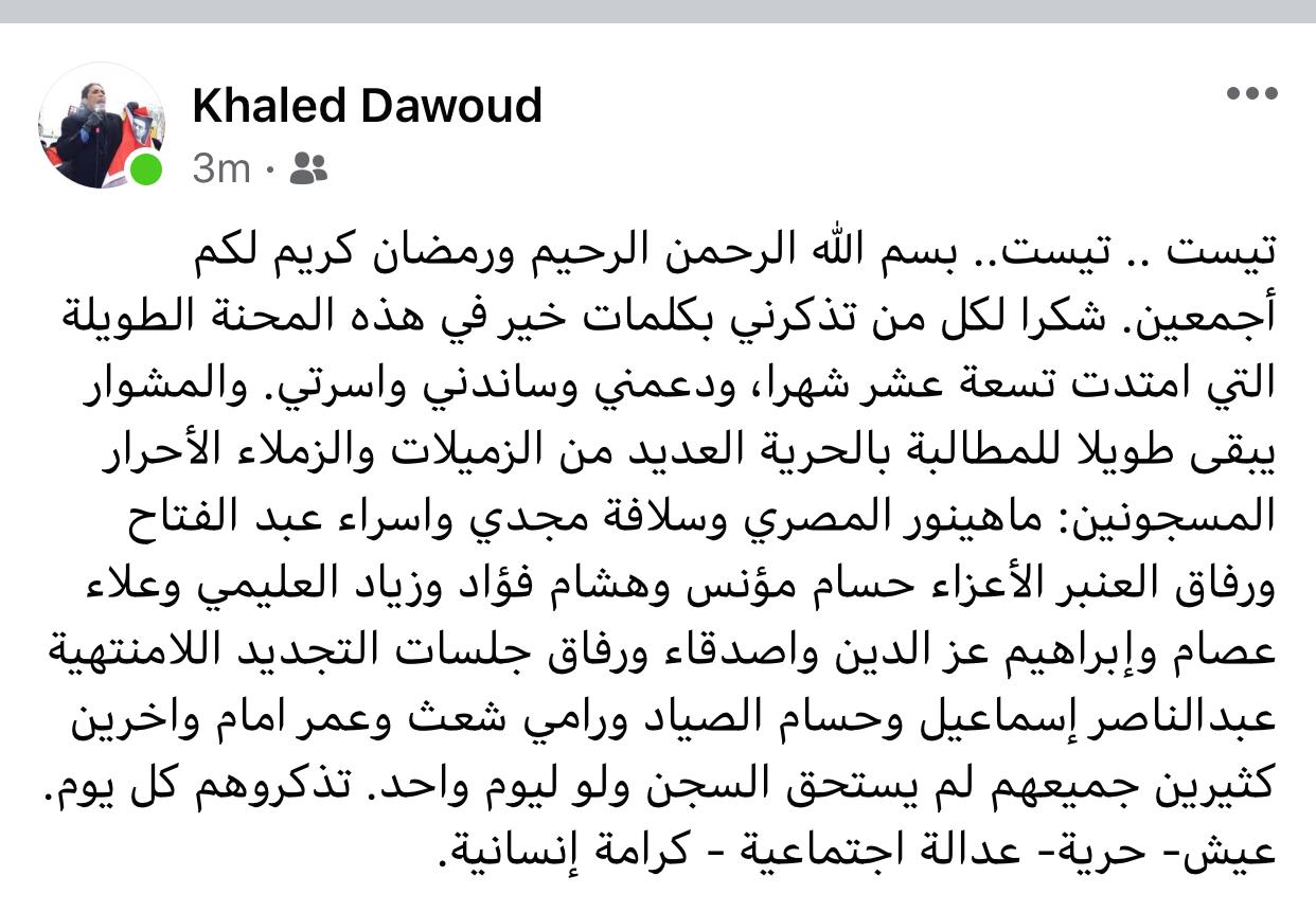 ونشر داوود عبر صفحته الشخصية على موقع التواصل الإجتماعي فيس بوك: "تيست .. تيست.. بسم الله الرحمن الرحيم ورمضان كريم لكم أجمعين شكرا لكل من تذكرني بكلمات خير في هذه المحنة الطويلة التي امتدت تسعة عشر شهرا، ودعمني وساندني وأسرتي".