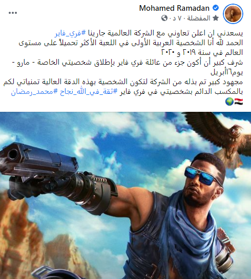 ونشر رمضان صورة له، عبر حسابه الرسمي على موقع التواصل الاجتماعي "فيس بوك"، قائلًا: "يسعدني أن أعلن تعاوني مع الشركة العالمية جارينا فري فاير".