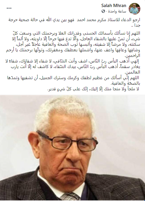 ودون مهران عبر صفحته الرسمية على موقع التواصل الاجتماعى “فيس بوك “، ”ارجو الدعاء للأستاذ مكرم محمد أحمد فهو بين يدي الله في حالة صحية حرجة جدا”.