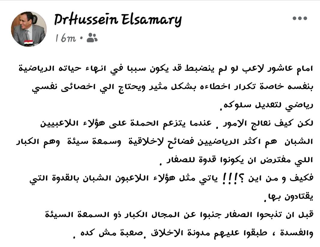 وكتب حسين السمري عبر حسابه على موقع التواصل الاجتماعي "فيس بوك": "إمام عاشور لاعب لو لم ينضبط قد يكون سببًا في إنهاء حياته الرياضية بنفسه خاصة تكرار أخطائه بشكل مثير".