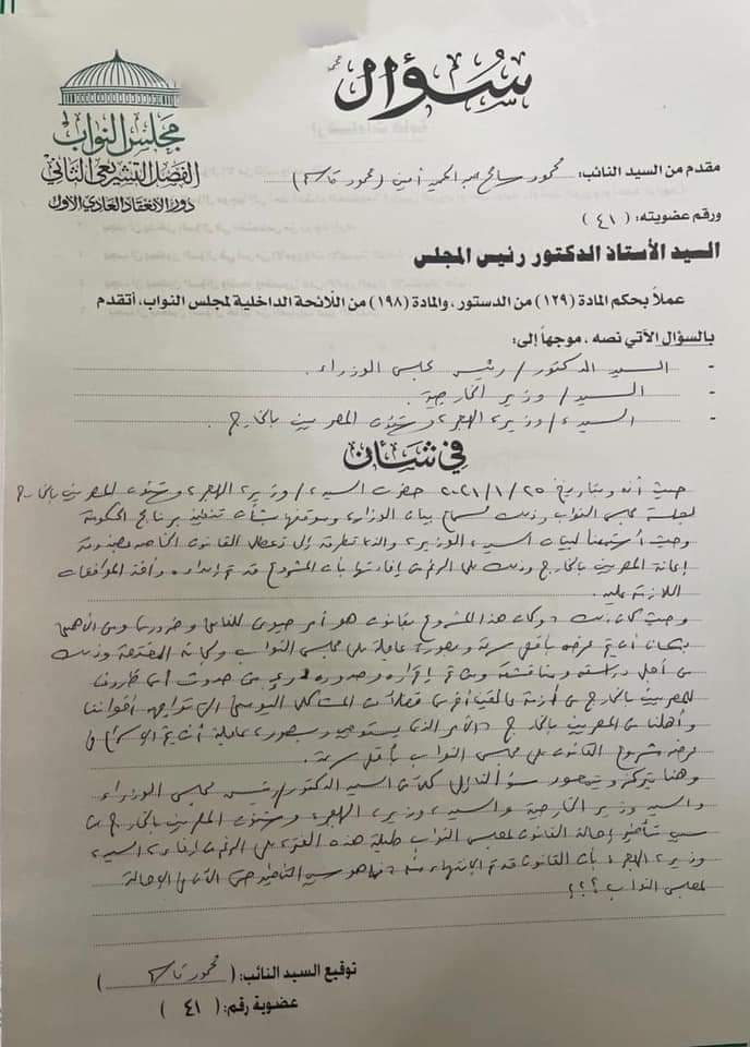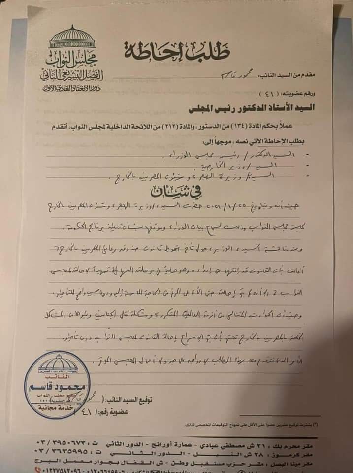 وكان النائب قد أكد النائب في طلبه، أن وزيرة الهجرة أفادت أن القانون قد انتهي من بحثه وجاري عرضه علي مجلس النواب، إلا أنه لم يتم إحالته دون سبب واضح.