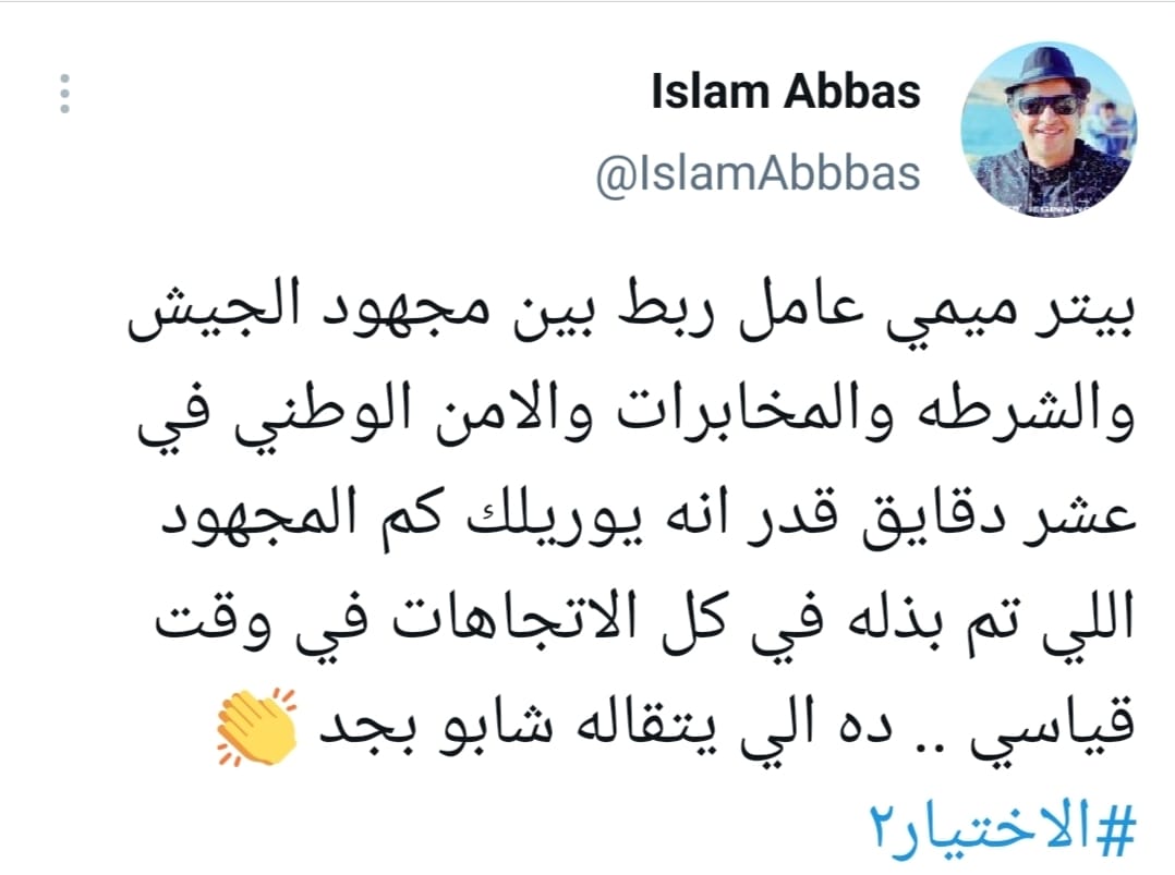 وقال إسلام عباس: “بيتر ميمي عامل ربط بين مجهود الجيش والشرطه والمخابرات والامن الوطني في عشر دقايق قدر انه يوريلك كم المجهود اللي تم بذله في كل الاتجاهات في وقت قياسي .. ده الي يتقاله شابو بجد”