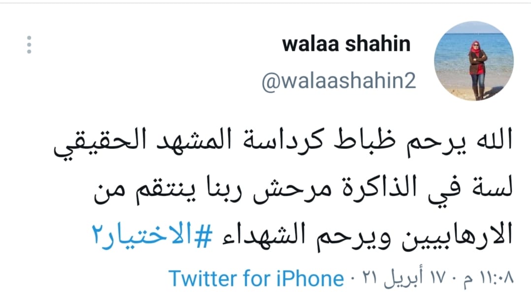 وعلقت ولاء شاهين قائلة: “الله يرحم ظباط كرداسة المشهد الحقيقي لسة في الذاكرة مرحش ربنا ينتقم من الارهابيين ويرحم الشهداء”