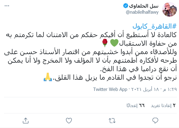 وتابع: "وللأصدقاء ممن أبدوا خشيتهم من اقتصار الأستاذ حسن على طرحه لأفكاره، أطمئنهم بأن لا المؤلف ولا المخرج ولا أنا، يمكن أن نقع دراميا في هذا الفخ، ونرجو أن تجدوا في القادم ما يزيل هذا القلق".