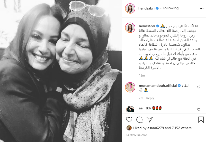 ونشرت هند صورة لها مع الراحلة، عبر حسابها الرسمي بموقع تبادل الصور والفيديوهات الصيرة "انستجرام"، وعلقت عليها قائلة: "إنا لله وإنا إليه راجعون، توفيت إلى رحمة الله تعالى السيدة هالة زين، زوجة الفنان المرحوم خالد صالح ووالدة الفنان أحمد خالد صالح، وعلياء خالد صالح".