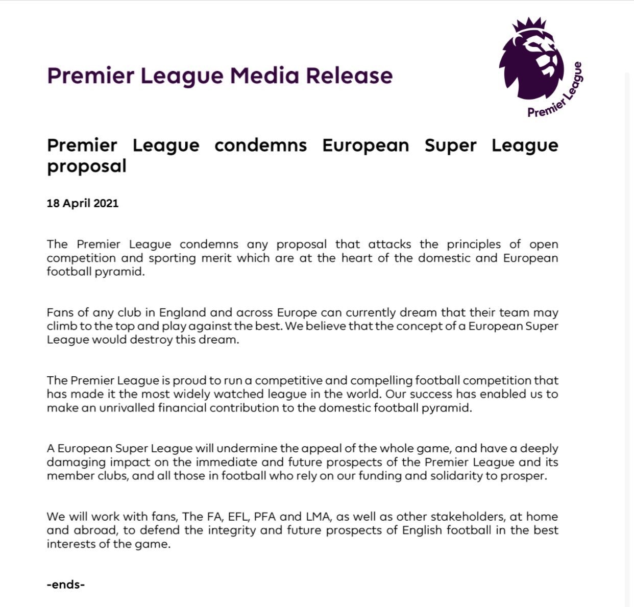وقالت الرابطة في بيان رسمي: "يدين الدوري الإنجليزي أي اقتراح يهاجم مبادئ المنافسة المفتوحة والجدارة الرياضية التي تقع في قلب هرم اتحاد كرة القدم المحلي والأوروبي".