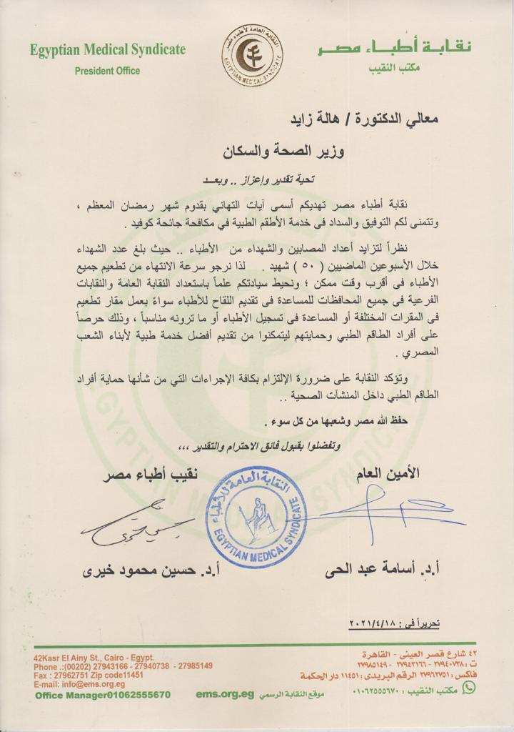 لذا نرجو سرعة الانتهاء من تطعيم جميع الأطباء في أقرب وقت ممكن ؛ ونحيط سيادتكم علما باستعداد النقابة العامة والنقابات الفرعية في جميع المحافظات للمساعدة في تقديم اللقاح للأطباء سواء بعمل مقار تطعيم في المقرات المختلفة أو المساعدة في تسجيل الأطباء أو ما ترونه مناسبا.