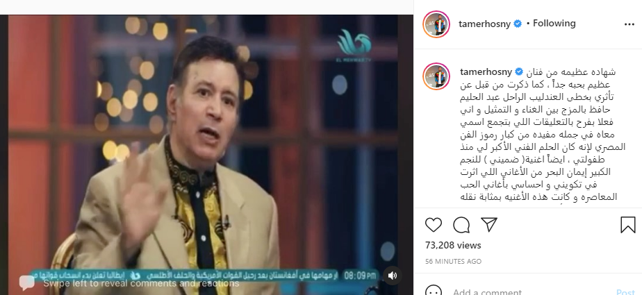 وكتب تامر حسني الفيديو، عبر حسابه الرسمي بموقع تبادل الصور والفيديوهات القصيرة "انستجرام" معلقًا: "شهادة عظيمة من فنان عظيم بحبه جدًا، كما ذكرت من قبل عن تأثري بخطى العندليب الراحل عبد الحليم حافظ بالمزج بين الغناء والتمثيل، وإني فعلًا بفرح بالتعليقات اللي بتجمع اسمي معاه في جملة مفيدة من كبار رموز الفن المصري".