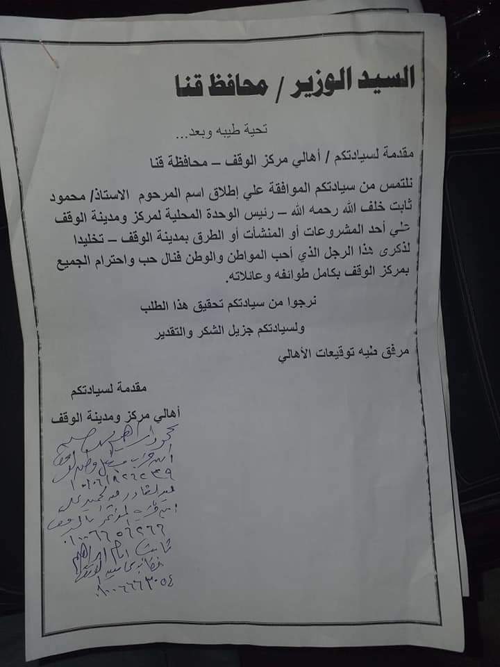 وقدم أهالي الوقف طلبا للواء أشرف الداودي، محافظ قنا، جاء فيه: "نلتمس من سيادتكم الموافقة على إطلاق اسم محمود ثابت خلف الله، رئيس الوحدة المحلية لمركز ومدينة الوقف، على أحد المشروعات أو المنشأة أو الطرق بمدينة الوقف، تخليدًا لذكرى هذا الراجل الذي أحب المواطن والوطن فنال حب واحترام الجميع بمركز الوقف بكامل طوائفه وعائلاته".