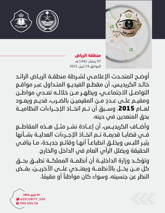 وقال المتحدث باسم الشرطة بمدينة الرياض، إن إعادة نشر مثل هذه المقاطع في قضايا قديمة يثير اللبس ويخلق انطباعًا أنها وقائع جديدة وهذا ينافي الحقيقة ويضلل الرأي العام، جاء ذلك في بيان نشرته الإمارة عبر صفحتها الرسمية على تويتر.