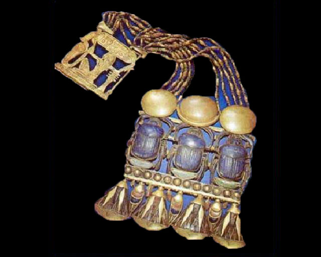 وأضاف المصدر في تصريحات خاصة لـ“القاهرة 24”، أن قلادات توت عنخ آمون بالمتحف الكبير وصل عددها إلى 5 قلادات مختلفة الأشكال والأحجام، مشيرًا إلى أن من قلادات الملك توت عنخ آمون قلادة مستطيلة الشكل مصنوعة من الذهب واللازورد وقوامها ثلاث جعارين من اللازورد يعلو كل منهم قرص الشمس، وتم اكتشافها في وادي الملوك بالأقصر وتعود للأسرة الثامنة عشرة.