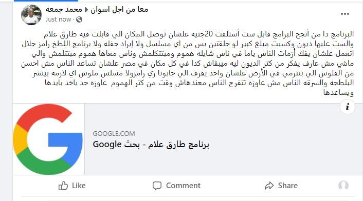 وكتب حساب يحمل اسم محمد جمعة منشورًا أشار فيه إلى نجاح برنامج كلام من دهب، الذي يهدف إلى مساعدة الحالات الإنسانية، ففكرته تقوم على أساس سؤال يسأله الإعلامي طارق علام ومن يعرف الإجابة يفوز بمبلغ 100 ألف جنيه.