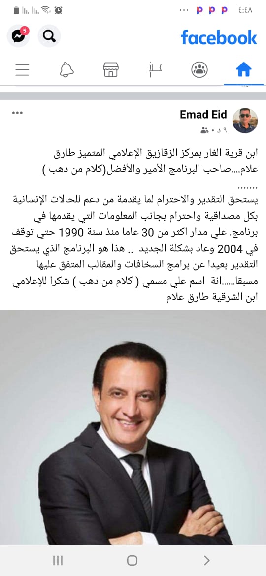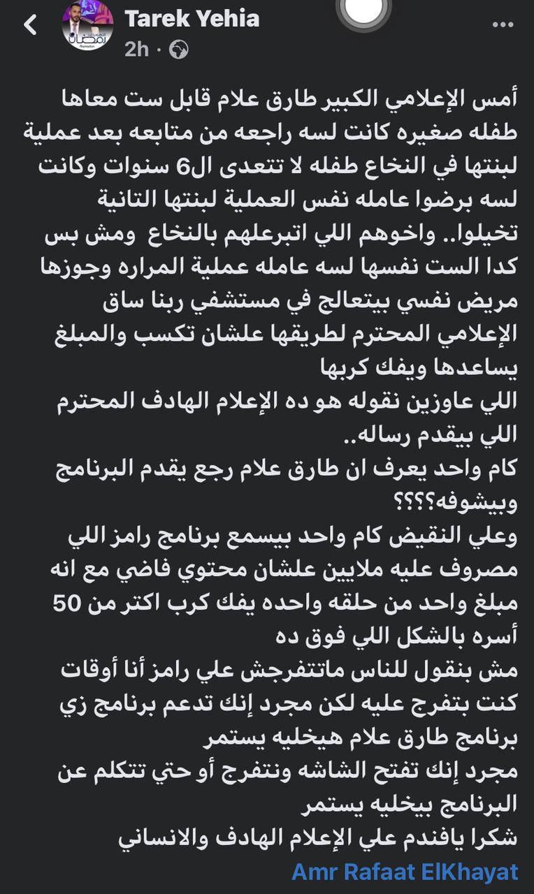 وقدم حساب باسم “عماد عيد” الشكر والتقدير للإعلامي طارق علام على برنامجه الهادف الذي يقدم الدعم للحالات الإنسانية بكل مصداقية بحسب تعبيره، وقارن الحساب بين البرنامج وبرامج المقالب الأخرى التي لا تفيد الجماهير.