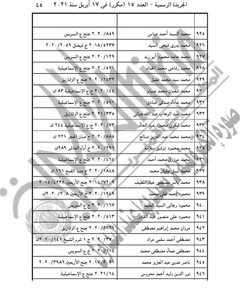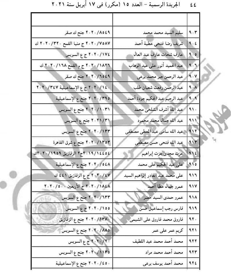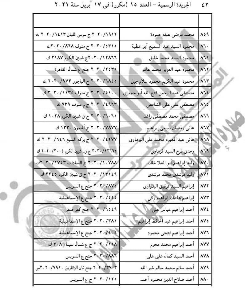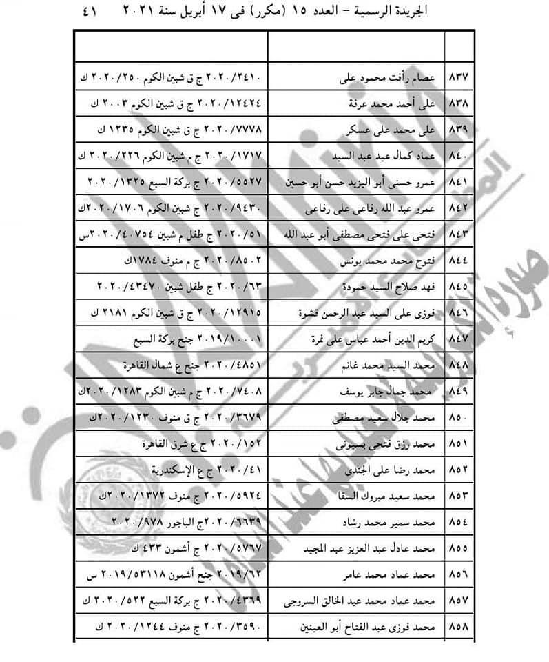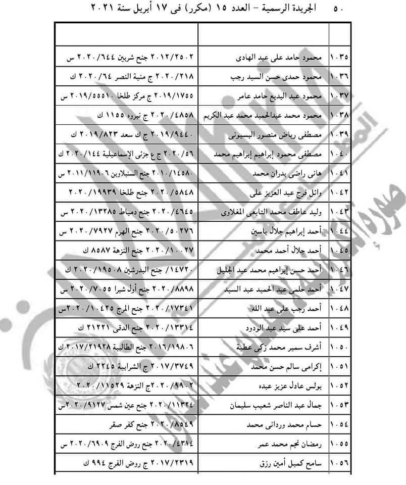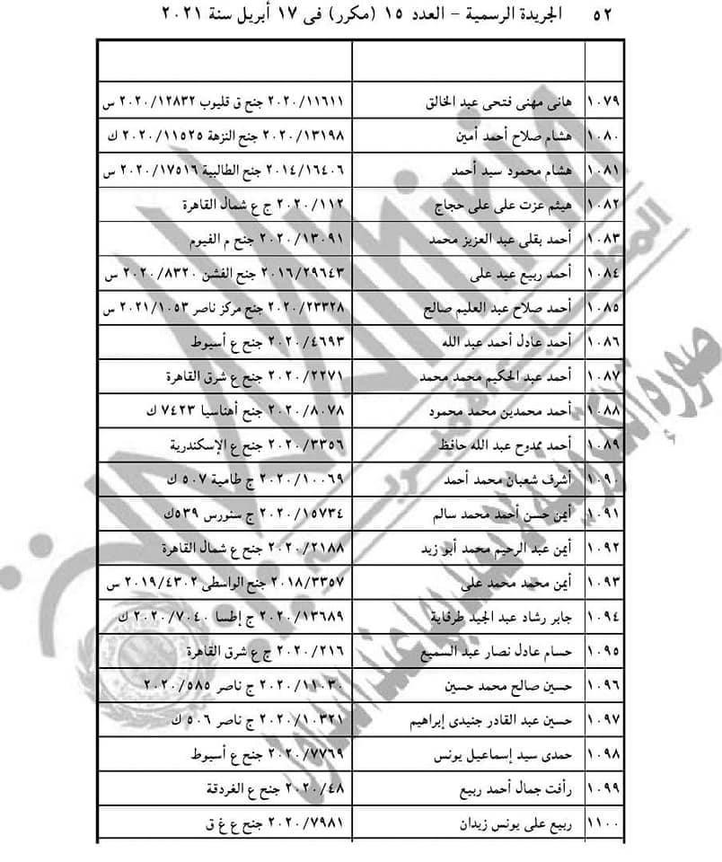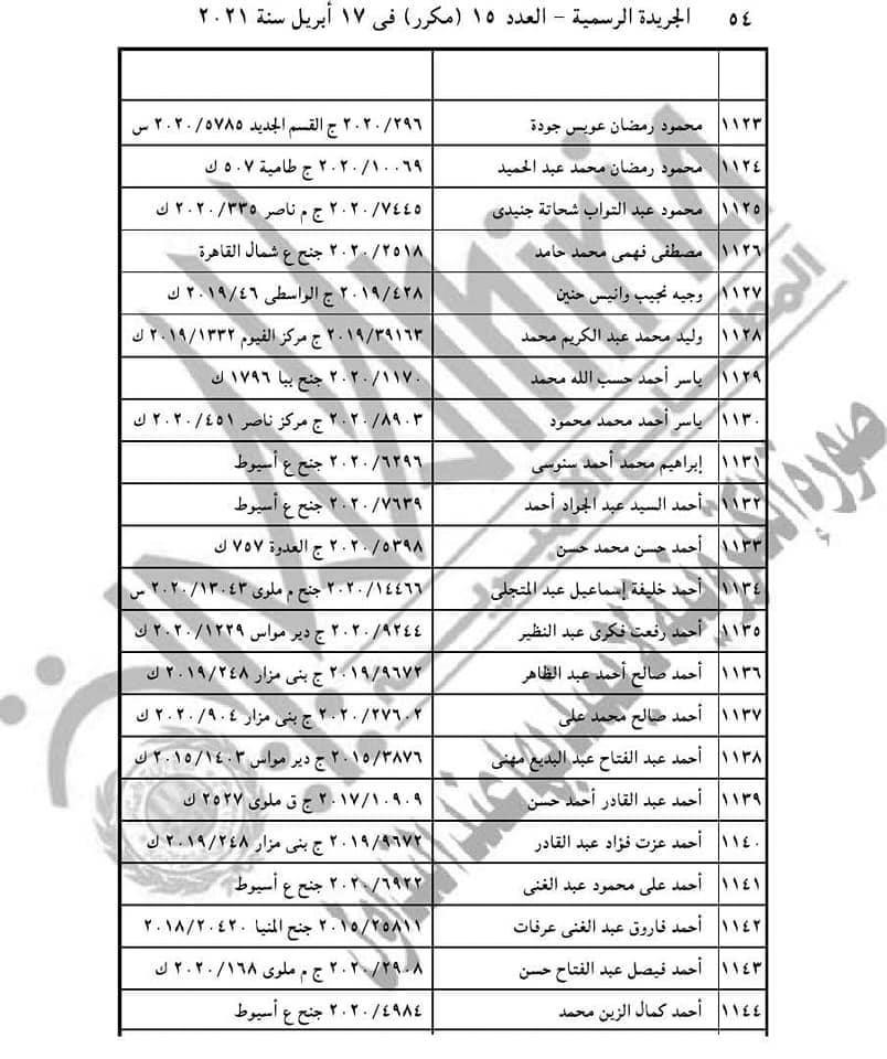 نشرت الجريدة الرسمية، اليوم الأربعاء، قرار الرئيس عبد الفتاح السيسي رقم 155 لسنة 2021، حيث نصت مادته الأولى على أن: "يعفى عن العقوبة الأصلية أو ما تبقى منها وعن العقوبة التبعية المحكوم بها على 1686 محكوما عليهم والواردة أسماؤهم وأرقام قضاياهم بالكشوف المرفقة أولهم، أحمد حسنى فتحي عبد الوهاب، وآخرهم أيمن عبد النبي عبده على عامر، وذلك ما لم يكن أي منهم محكوما عليه في قضايا أخرى".