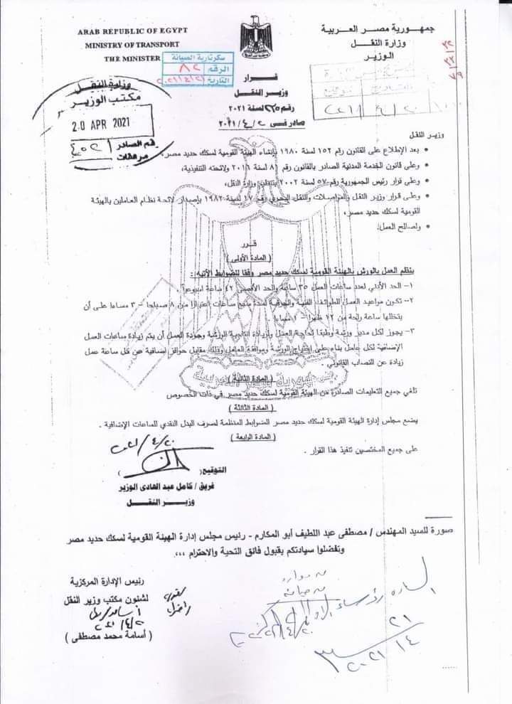 وألغى قرار وزير النقل الصادر رقم 4521 بتاريخ 24/4/2021 جميع التعليمات الصادرة من قبل هيئة السكة الحديد بشأن ضوابط ساعات العمل على أن يضع مجلس الإداراة ضوابط صرف البدل النقدي للساعات الإضافية.