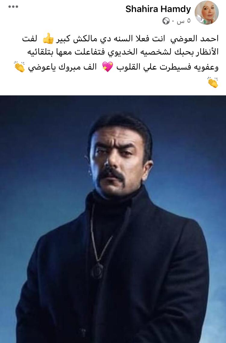وكتبت شهيرة عبر حسابها الرسمي بموقع التواصل الاجتماعي "فيس بوك": "أحمد العوضي أنت فعلا السنة دي مالكش كبير، لفت الأنظار بحبك لشخصية الخديوي، فتفاعلت معها بتلقائية وعفوية، فسيطرت على القلوب، الف مبروك يا عوضي".
