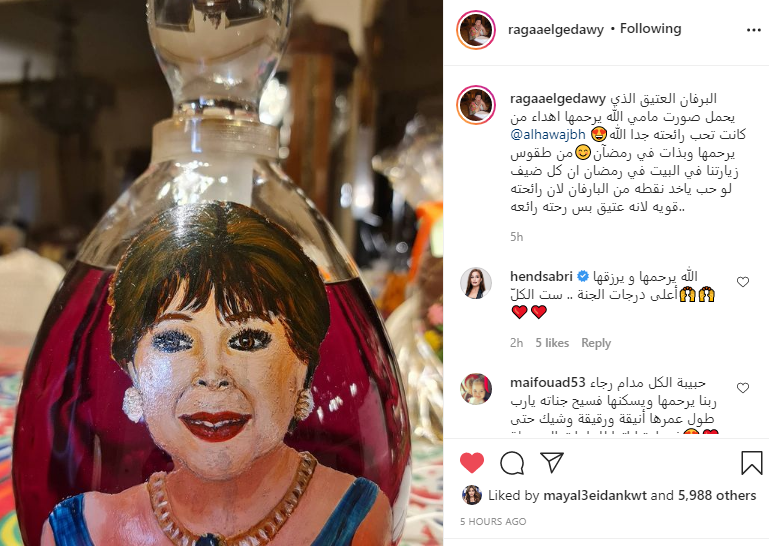 ونشرت أميرة صورة للعطر الخاص بوالدتها وعليه صورة الراحلة، وذلك عبر الصفحة الشخصية للجداوي على موقع تبادل الصور والفيديوهات الشهير "انستجرام"، قائلة: "البرفان العتيق الذي يحمل صورة مامي الله يرحمها، كانت تحب رائحته جدا الله يرحمها وبذات في رمضان".