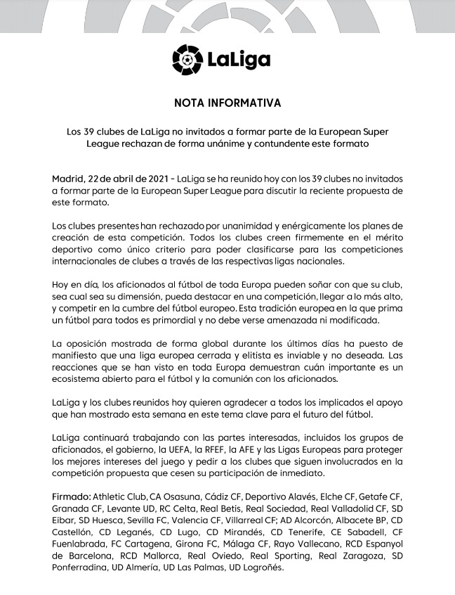 وأفادت الليجا في بيان رسمي، على موقع التواصل الاجتماعي "تويتر"، أن الأندية رفضت بالإجماع فكرة إقامة دوري السوبر ليج حفاظًا على كرة القدم والشكل الطبيعي المعروف للمنافسة.