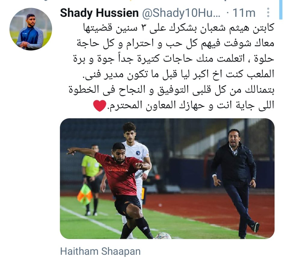 وكتب شادي حسين عبر صحفته على "انستجرام": “كابتن هيثم شعبان بشكرك على 3 سنين قضيتها معاك شوفت فيهم كل حب واحترام وكل حاجة حلوة ، اتعلمت منك حاجات كتيرة جدًا جوة وبرة الملعب، كنت أخ اكبر ليا قبل ما تكون مدير فني، بتمنالك من كل قلبى التوفيق والنجاح في الخطوة اللي جاية انت وجهازك المعاون المحترم”.