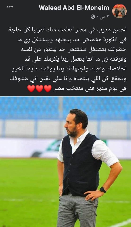 في المقابل أشاد وليد عبد المنعم بمديره الفني السابق قائلًا: “احسن مدرب في مصر اتعلمت منك تقريبا كل حاجة في الكورة مشفتش حد بيجتهد وبيشتغل زي ما حضرتك بتشتغل، مشفتش حد بيطور من نفسه وفرقته زي ما انتا بتعمل، ربنا يكرمك على قد اخلاصك وتعبك واجتهادك، ربنا يوفقك دايما للخير وتحقق كل اللي بتتمناه، وأنا علي يقين إني هشوفك في يوم مدير فني منتخب مصر”.