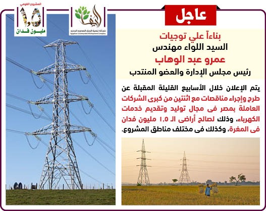 أكد اللواء مهندس عمرو عبد الوهاب رئيس مجلس الإدارة والعضو المنتدب لشركة تنمية الريف المصري الجديد أنه سوف يتم الإعلان خلال الأسابيع القليلة المقبلة عن طرح وإجراء مناقصات مع اثنتين من كبرى الشركات العاملة بمصر في مجال توليد وتقديم خدمات الكهرباء، وذلك لصالح أراضي الـ 1.5 مليون فدان في المغرة، وكذلك في مختلف مناطق المشروع.
