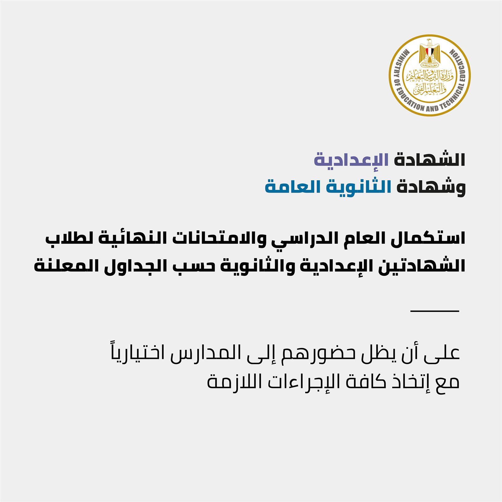 وفيما يخص موقف الشهادتين الإعدادية والثانوية في العام الدراسي الجاري، قالت الوزارة، إن الطلاب سيستكملون العام الدراسي بشكل طبيعي حسب الجداول المعلنة، موضحة أن حضور الطلاب للمدارس يظل اختياريا مع تطبيق الدولة لكافة الإجراءات الاحترازية أثناء الامتحانات التجريبية والنهائية.