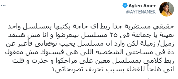 وكتبت آيتن عامر في تغريدة على حسابها الرسمي بموقع التغريدات القصيرة “تويتر”، وقالت فيها: “مستغربة جدًا ربط أى حاجة بكتبها بمسلسل واحد بعينه، يا جماعة في 25 مسلسل بيتعرضوا وأنا مش هنتقد زميل/ زميلة”.
