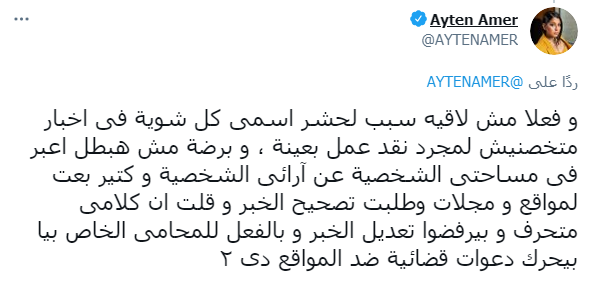 أعربت الفنانة آيتن عامر عن استيائها، من تداول تغريداتها بشكل مُحرف، مشيرةً أن ما تكتبه على مواقع التواصل الاجتماعي هو آرائها الشخصية في المساحة المتاحة لها.