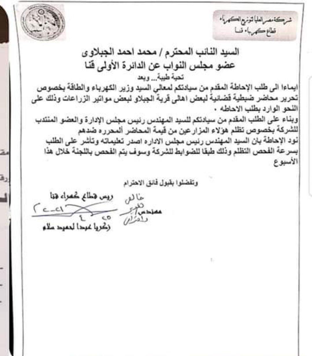 ومن جهتها أكد قطاع كهرباء قنا، أنه بناء على الطلب المقدم من النائب محمد الجبلاوي بشأن الضبطية القضائية لمزارعي الجبلاو وتضررهم من المحاضر المحررة ضدتهم فإن المهندس زكريا عبد الحميد رئيس قطاع كهرباء قنا وجه بسرعة فحص التظلم طبقا لضوابط الشركة.