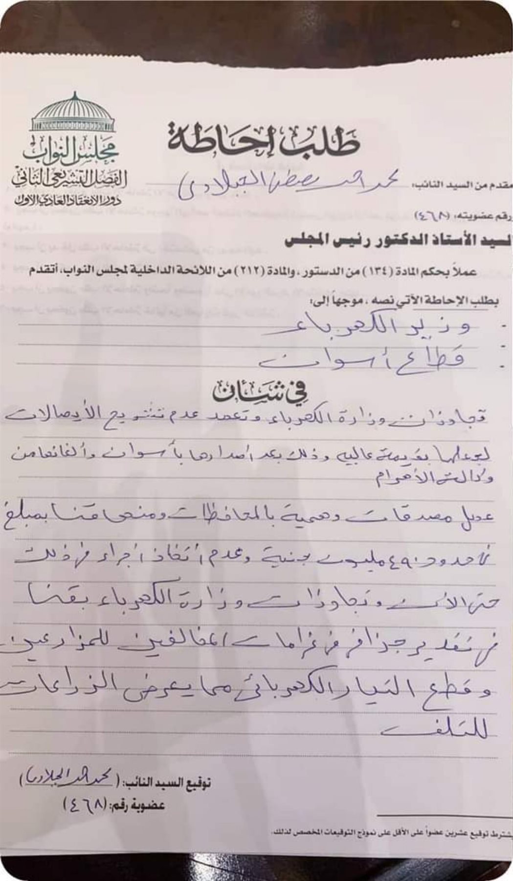 وقال الجبلاوي في طلب الإحاطة: "تجاوزات وزارة الكهرباء وعدم تشريح الإيصالات لجعلها بقيمة عالية وذلك بعد إصدارها وإلغائها من وكالة الأهرام، وعمل مصدات وهمية ومنها قنا بمبلغ 490 مليون جنيه وعدم اتخاذ إجراء في ذلك حتى الآن".