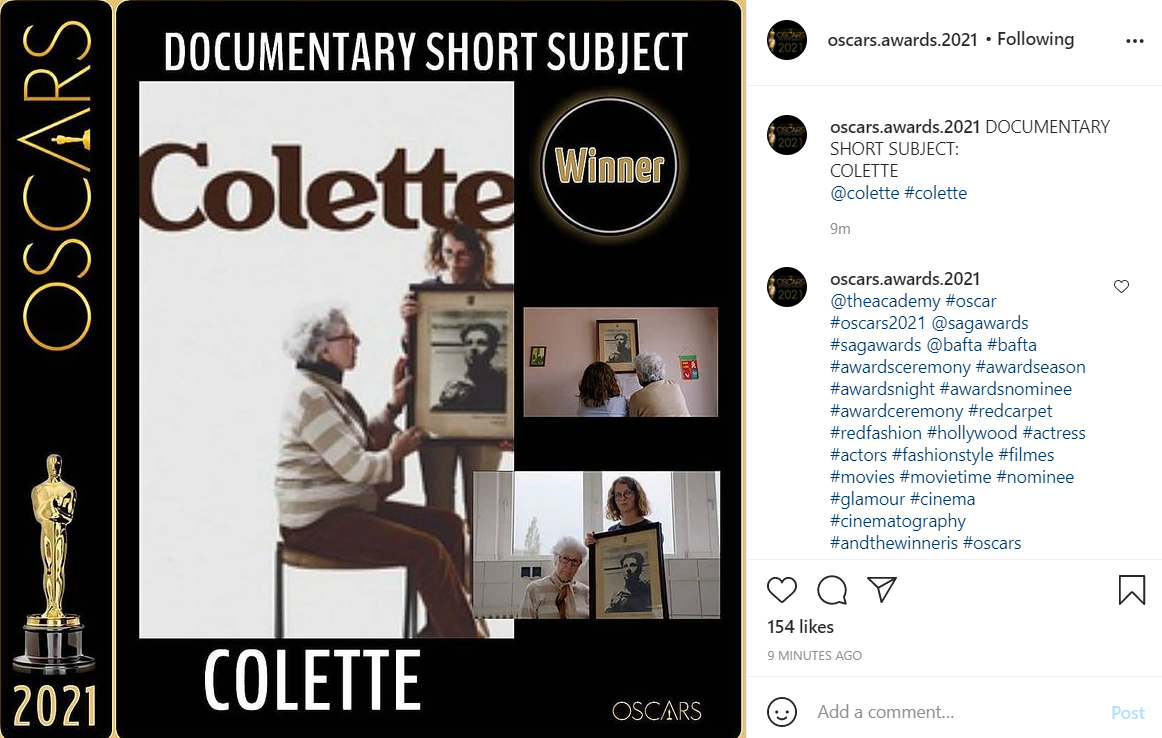 فاز فيلم “Colette”،على جائزة الأوسكار لأفضل فيلم وثائقي قصير، وذلك خلال الحفل السنوي في حفل توزيع جوائز الأوسكار في دورته الـ93، المقامة حاليا على مسرح محطة يونيون بأمريكا.