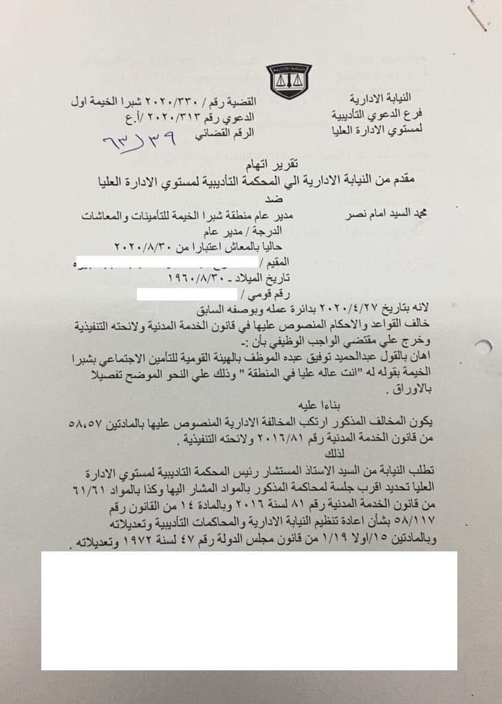 إحالة مدير عام منطقة شبرا الخيمة للتأمينات والمعاشات للمحاكمة التأديبية (مستند)