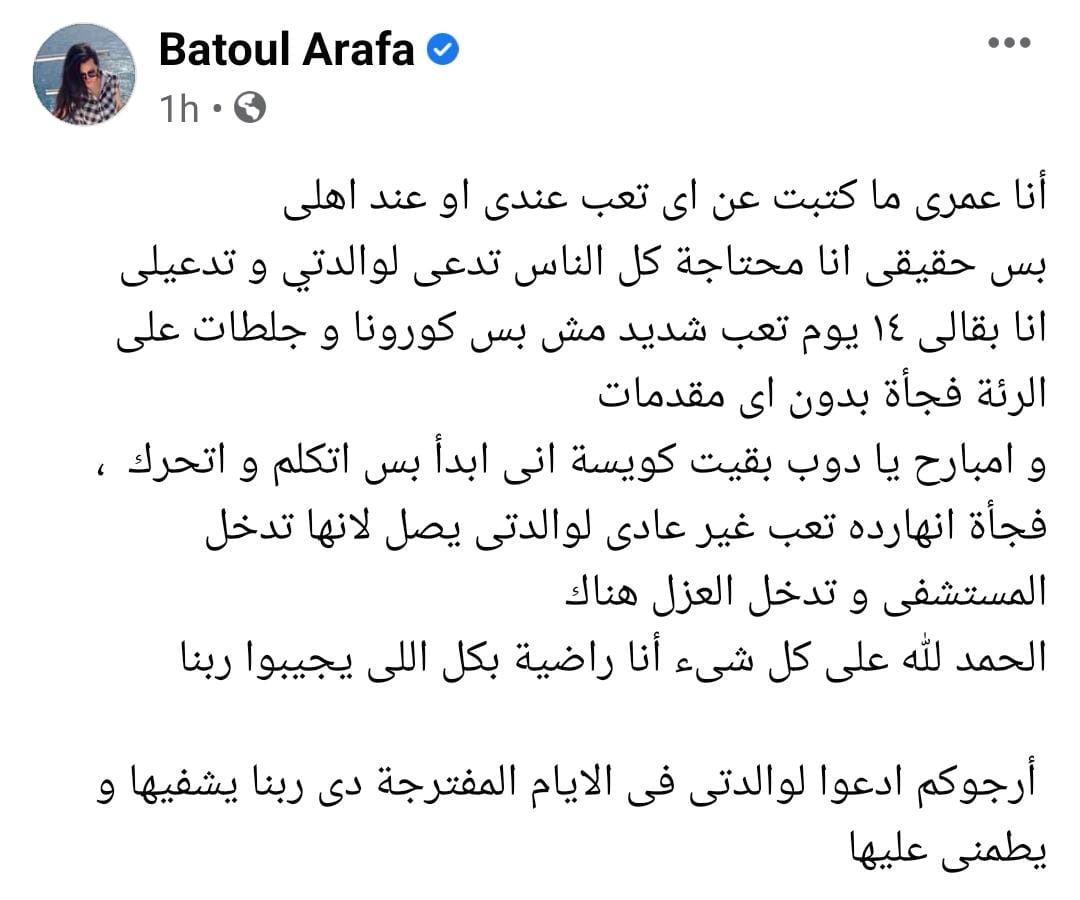 وكتبت بتول منشور عبر حسابها الرسمي على موقع التواصل الاجتماعي “فيس بوك”، قائلةً: “أنا عمري ما كتبت عن أي تعب عندي أو عند أهلي، بس حقيقى أنا محتاجة كل الناس تدعى لوالدتي وتدعيلي”.