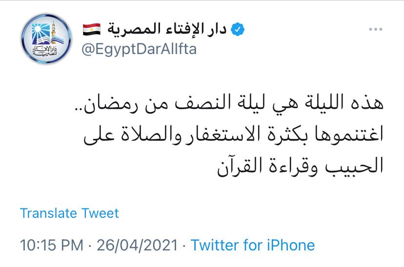 طالبت دار الإفتاء المصرية جميع عموم المسلمين باغتنام ليلة النصف من شهر رمضان حيث تسارعت خطى الأيام المباركة، وانتصف الشهر المبارك، ويجب اغتنامها.