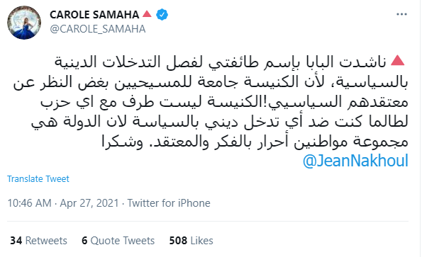 وكتبت كارول تغريدة، عبر حسابها الرسمي بموقع التدوينات القصيرة "تويتر"، قائلة: "ناشدت البابا باسم طائفتي لفصل التدخلات الدينية بالسياسية، لأن الكنيسة جامعة للمسيحيين بغض النظر عن معتقدهم السياسي!".