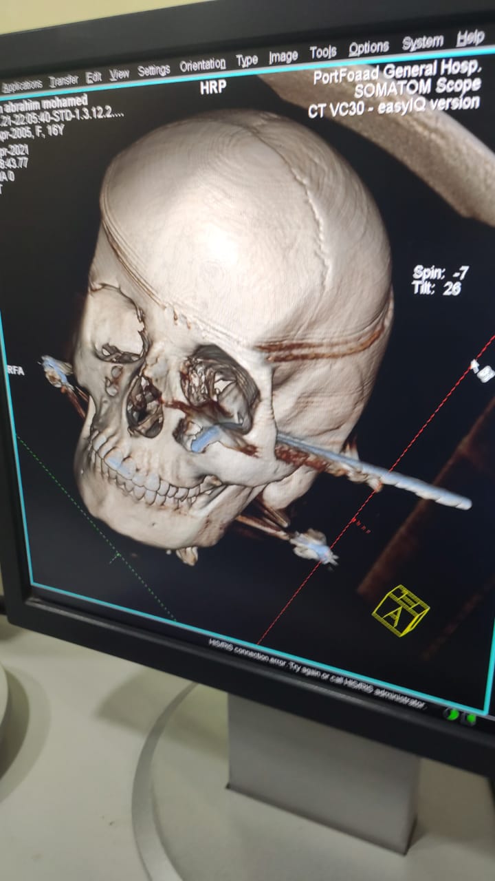 وأوضحت الهيئة، أنه وصلت إلى مستشفى السلام بورسعيد، طفلة عمرها 15 عامًا بعد نقلها من مستشفى الحياة بور فؤاد مصابة بسيخ حديدي نافذ في الرأس إثر تعرضها لحادث، وأنه تم عمل الفحوصات والأشعة اللازمة وتقرر تحويلها فورًا إلى طوارئ مستشفى السلام ببورسعيد.