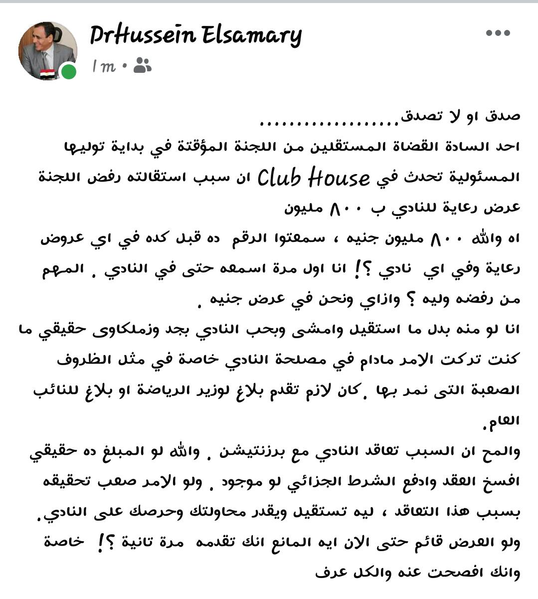 وكتب حسين السمري عبر حسابه على "فيس بوك": "أحد السادة القضاة المستقيلين من اللجنة المؤقتة في بداية توليها المسئولية تحدث في Club House أن سبب استقالته رفض اللجنة عرض رعاية للنادي بـ 800 مليون".