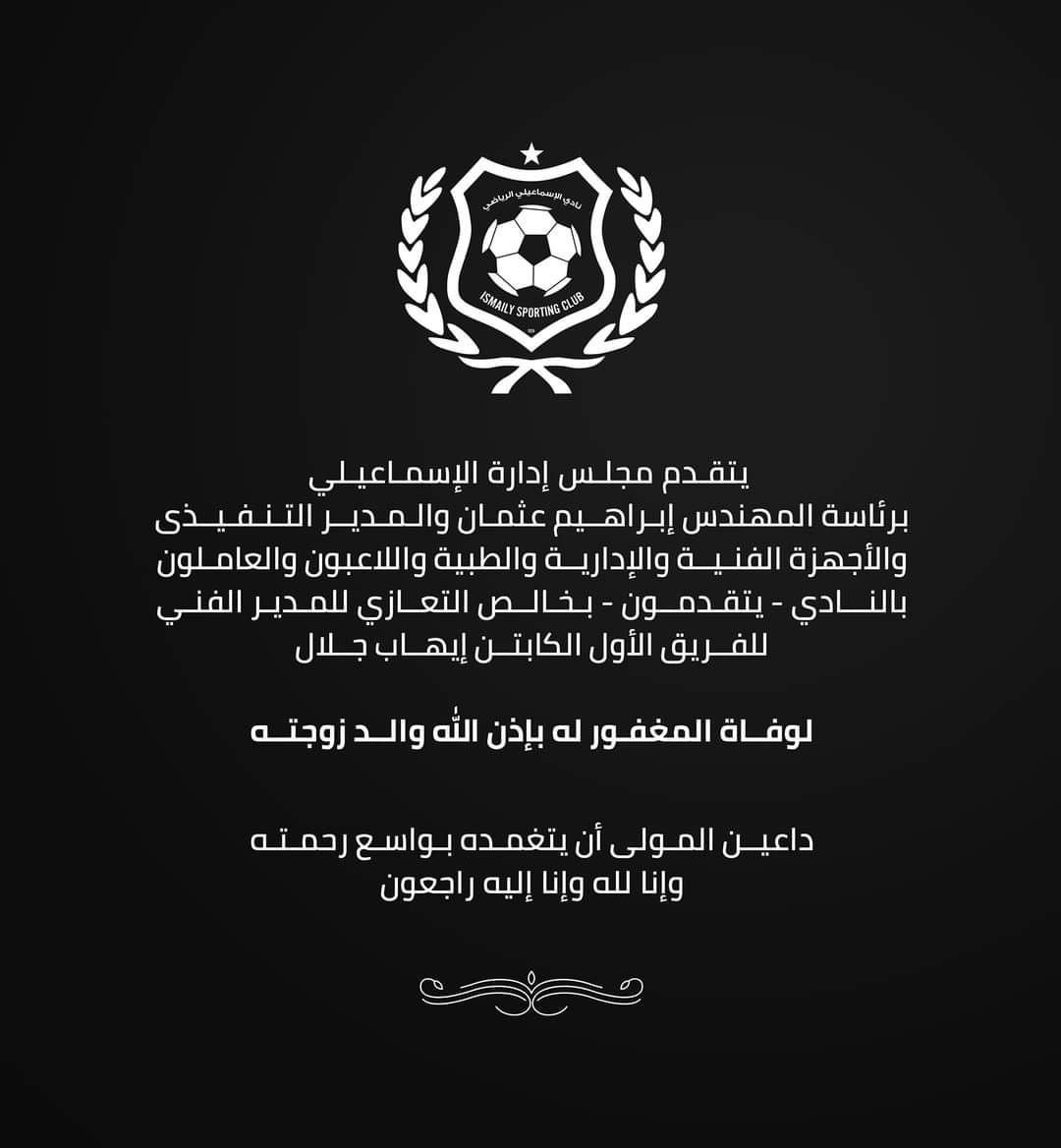 ونشر الإسماعيلي بيانًا عبر صفحته الرسمية على موقع التواصل الاجتماعي فيس بوكن قال فيه: "يتقدم مجلس إدارة الإسماعيلي برئاسة المهندس إبراهيم عثمان والمدير التنفيذي، والأجهزة الفنية والإدارية والطبية واللاعبون والعاملون بالنادي، بخالص التعازي للمدير الفني للفريق الأول الكابتن إيهاب جلال، لوفاة المغفور له بإذن الله والد زوجته، داعين المولى أن يتغمده بواسع رحمته، وإنا لله وإنا إليه راجعون".